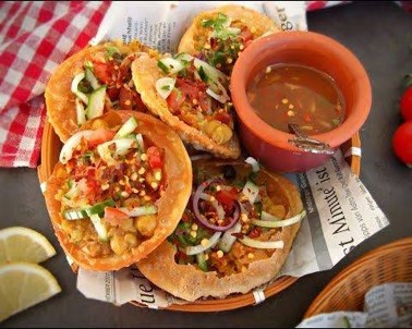 つぎは、「フチュカ」です。これは パリパリしたものの中に、まめのペーストをいれたり、ちょっとすっぱいサワーソースをそそいだりして、ていきょうされています。まめのペーストは、ちょっとスパイシーです。ほとんどの人は これがだいすきです!