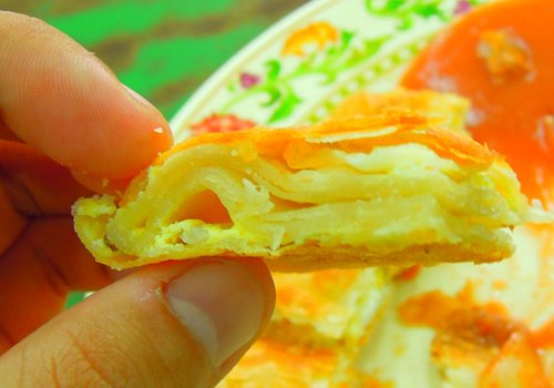 この写真は、バングラデシュの有名な 食べ物、「モグライ ポロタ」です。今日はこの食べ物について書きます。モグライ ポロタは、バングラデシュで一番おすすめのおかし で、たまごとこむぎこでつくるおかしです。これは、ゆうがたのおかしです。バングラデシュ人は、ゆうがたに、このおかしを食べます。このおかしは、サラダといっしょに 食べることができます。