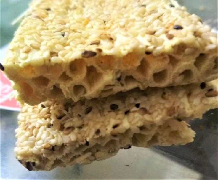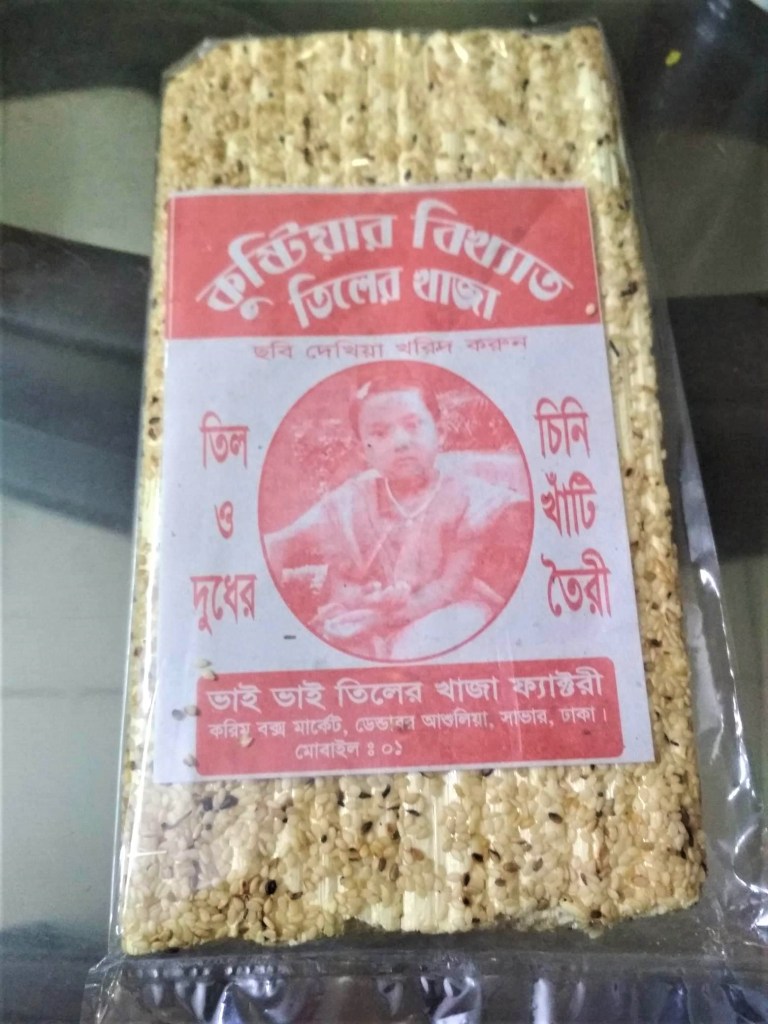 ゴマでつくられた「カジャ」というおかしは、バングラデシュのクシュティア(Kushtia)というちいきで 有名な おかしです。あまくて とてもおいしいです。パリパリしてながいです。